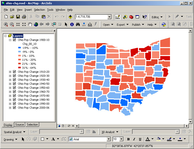 6. Copy and paste this layer: create as many layers as you have data for: one for 1900-1910, one for 1910-1920, and so on. I did the same for the total population data (one layer for 1900, one for 1910, etc.) but in a second ArcGIS project file (so two ArcGIS mxd files, one for population change, one for total population). Derived data, such as percent change, is best shown with a choropleth map. Total numbers, such as our total population, are not optimal for choropleth maps because geographic areas vary in size (and thus there may be more of something in a geographic area just because it is larger). But Ohio’s counties don’t vary much in size, so we can map totals (and gaze upon the map, as should you always, with a critical eye).