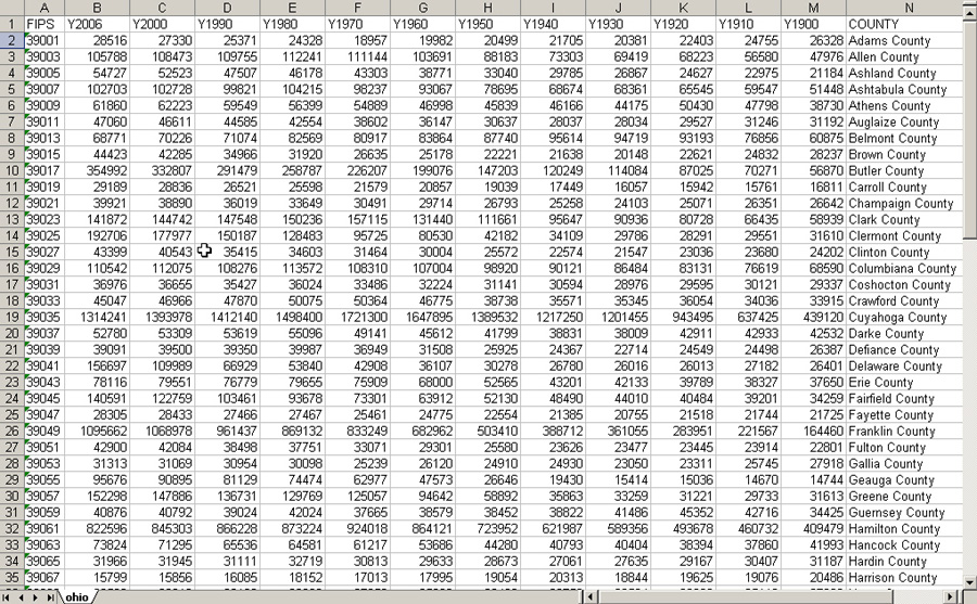 1. Get the historical population data, via the web: grab U.S. Census historical county population data (1900-90) and (2000-06) for your state.