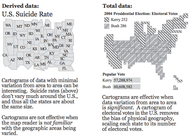 Cartograms can show derived data (suicide rate in U.S. states, left) or totals (electoral votes in U.S. states, right):