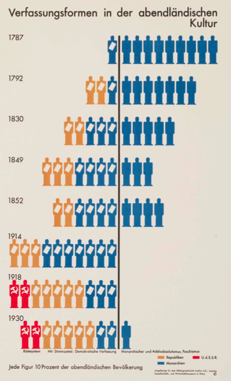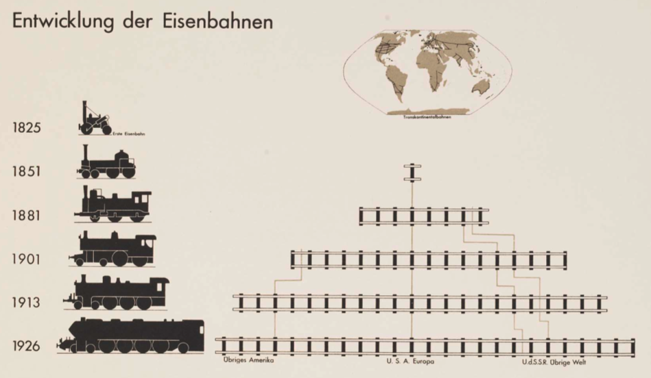 In casting about the internets, I was gladdened to find someone had scanned the isotype classic, Atlas of Gesellschaft und Wirtschaft (1930, 14+mb PDF). As far as I know the atlas was printed (on sheets) in limited numbers and has never been easy to find. Sybilla Nikolow discusses the atlas in her article “Society and Economy: An Atlas in Otto Neurath’s Pictorial Statistics from 1930.” (PDF)