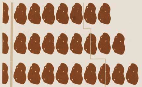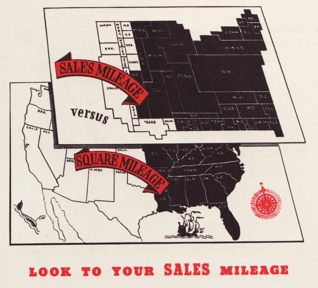 I had an old slide of the following cartogram but did not know its source: turns out it is from an advertisement for The Mutual Broadcasting Network, showing that 80% of business in the U.S. is transacted in states east of the Mississippi – MBN’s broadcasting area: