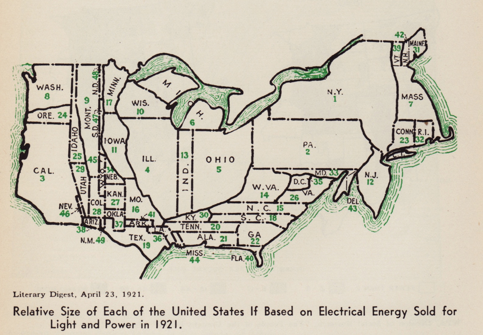 Cartogram, 1921: “Relative Size of Each of the United States if Based on Electrical Energy Sold for Light and Power in 1921” (Literary Digest, April 23, 1921)