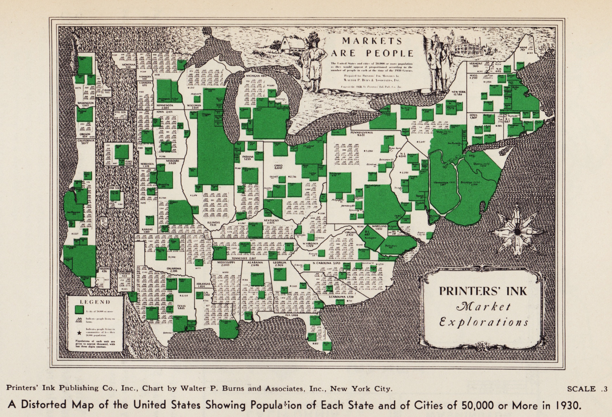 Cartogram, 1930: “A Distorted Map of the United States Showing Population of Each State and of Cities of 50,000 or More in 1930” (Printers’ Ink Publishing Co., Inc., Chart by Walter P. Burns and Associates, Inc., New York City)