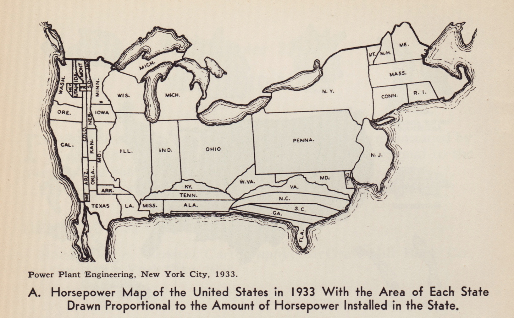 Cartogram, 1933: “Horsepower Map of the United States in 1933 With the Area of Each State Drawn Proportional to the Amount of Horsepower Installed in the State” (Power Plant Engineering, New York City, 1933)