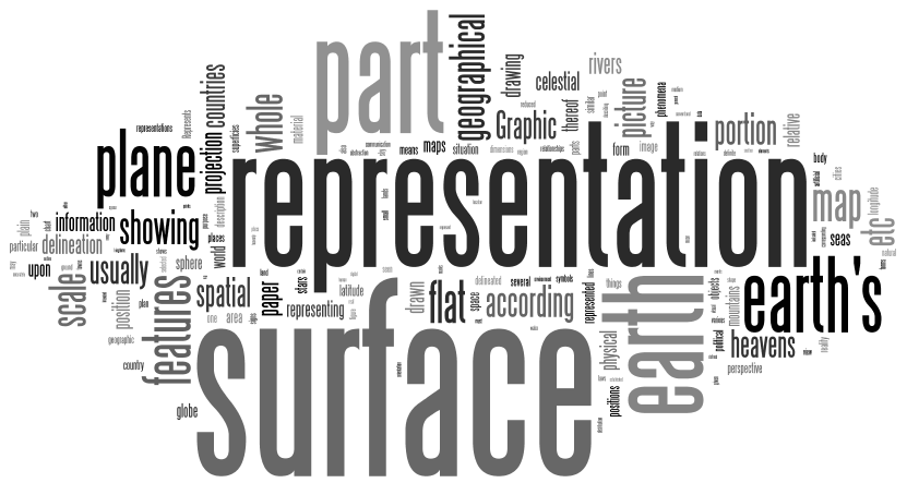 321) A representation, usually on a plane surface, of all or part of the earth or some other body showing a group of features in terms of their relative size and position (Norman J.W.Thrower, Maps and civilization: cartography in culture and society (Chicago: University of Chicago Press, 1996), p. 254).