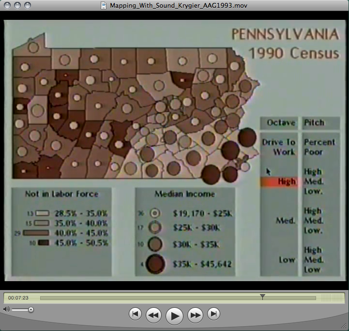 And, least and last, the 1991 seminar paper (For Mark Detweiler in Psychology 597a) that served as the basis of the Sound and Geographic Visualization book chapter: “An Elemental Approach to Animation and Sound in Information Graphics” (PDF, 1mb)